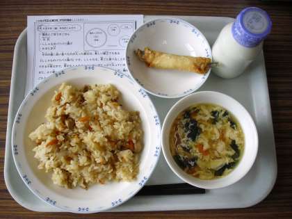 今日は、鶏肉とごぼうのごはん、牛乳、ししゃものパリパリ揚げ、かきたま汁です。
