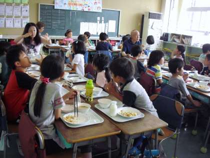 メモは、歯に良い食べ物についての最終回です。今日の歯に良い食べ物が入った献立は、新しい献立でもある『ししゃものパリパリ揚げ』です。ししゃもは、骨ごと食べることのできる小魚なので、骨のもととなるカルシウムがたっぷり入っています。、また、よく噛んでもらえるよう、餃子の皮を巻いて揚げることで、噛みごたえのある食感を出しています。頭からしっぽまで全部食べることができます。よく噛んで残さず食べましょう。 また、今日は、2年生がやまのき会のみなさんとふれあい給食をしました。やまのき会の方のお話に興味津々の2年生でした。