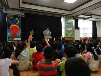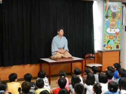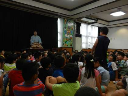 4年生は国語の単元で「落語 じゅげむ」を学習しています。その一環として、落語家の三遊亭右左喜(さんゆうていうさぎ)さんに本物の落語を見せていただきました。落語はテレビでは見たことあるという子もいましたが、初めて見るという子がほとんど。子どもたちは三遊亭右左喜さんが小話ひとつする度に笑い、どんどんと話に引き込まれていきました。また最後には、顔の向きや落語をする時に気をつけることを教えていただき、子どもたちも落語のイメージを掴むことができたと思います。落語が終わると子どもたちは、「楽しかった!」「おもしろかった!」「やってみたい!」と口々に言っており、自分たちの落語への意欲につながっているようでした。三遊亭右左喜さん、本当にありがとうございました。