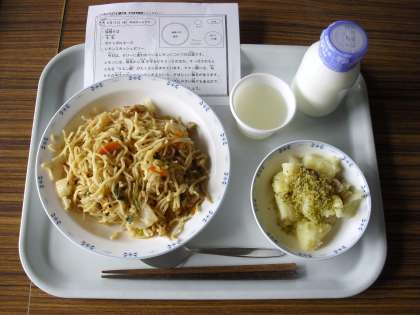 今日は、塩焼そば、牛乳、ポテトポロネーズ、レモンスカッシュゼリーです。
