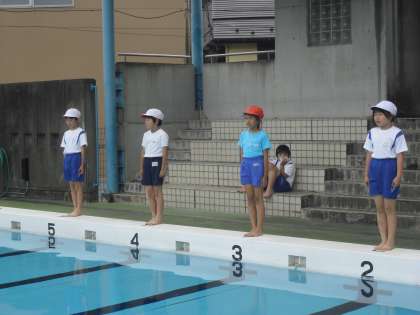 耳・・・先生の話を聞く、目・・・友達を励ます、足・・・プールサイドは歩く、心・・・あきらめない、めげない などキーワードで教師からは、話をしました。