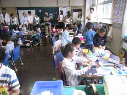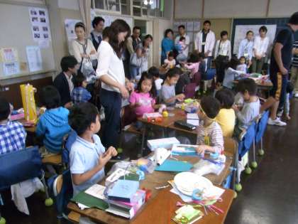 1年生は、4クラスとも図工の「うきうきボックス」作りを公開していました。