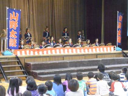 〆太鼓の小気味良いリズムに合わせて、ダンダンと体育館を揺るがすような音を響かせてくれたのは、山野太鼓の皆さんです。まだ始めて間もない子もいて、デビュー戦でしたが、とっても頑張ってくれました。