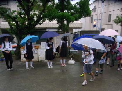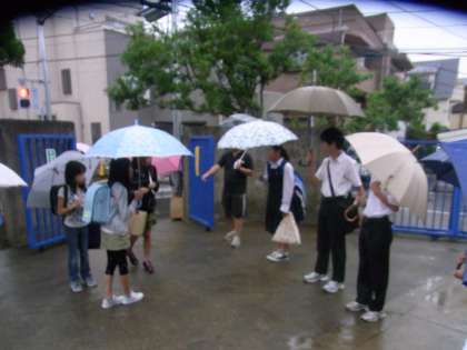 順序が逆になってしまいましたが、今日は砧の学び舎あいさつデーでした。砧中学校の1〜3年生で、山野小の卒業生の皆さんが雨の中わざわざ朝早く山野小まで出向いて、本校の代表委員の皆さんと一緒に竹内門であいさつ運動をしてくれました。