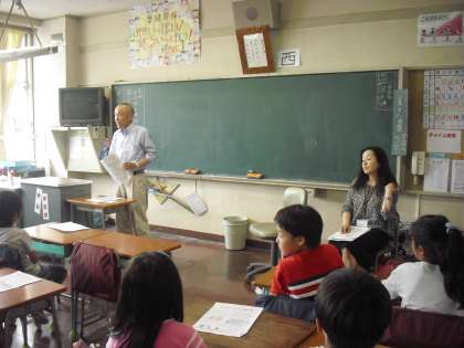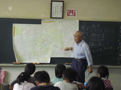 地域の方をお招きして、山野小学校の昔の様子、交通、商店街、鉄道、神社についてたくさんお話を伺うことができました。大きな地図を用意していただいたり、話の内容も考えてくださり、児童は興味津々で聞き入っていました。