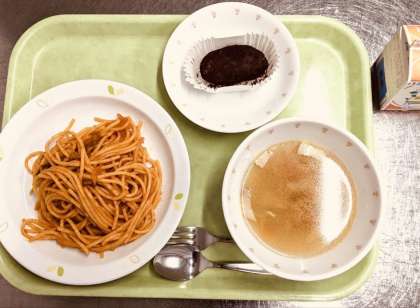 今日は、ナポリタン、野菜スープ、おかしな焼き芋「さつまのおいも」より、牛乳です。