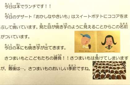 本でランチです。今日の絵本は、中川ひろたかさん作、村上康成さん絵の、「さつまのおいも」です。