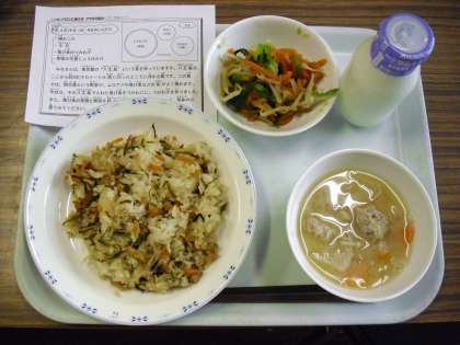 今日は、磯おこわ、牛乳、飛び魚のつみれ汁、野菜のしょうがじょうゆかけです。