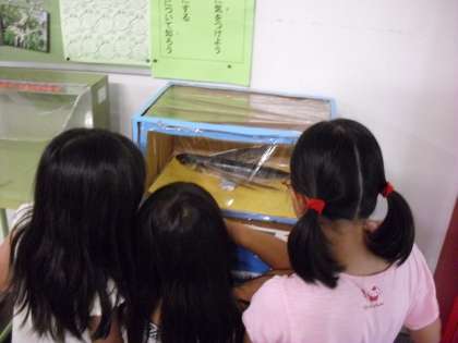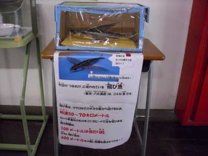 ※今日はトビウオの実物を給食室前に展示しました。たくさんの児童が覘いてくれたようです。
