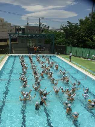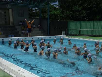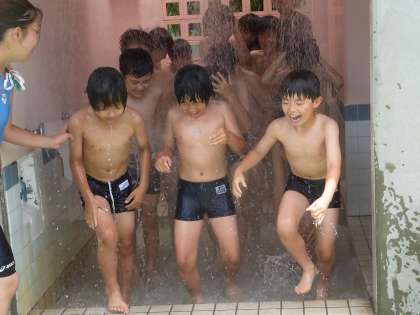 夏の到来を思わせる眩しい太陽の下、3年生がプールに入りました。とはいえども、シャワーの水はまだ冷たく感じます。シャワーを浴びるたびに、大きな声が響いていました。音楽に合わせての水慣れなど、とても気持ちよくプールに入ることができました。ニコニコ笑顔でした。