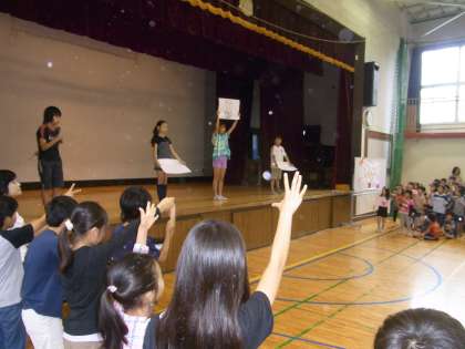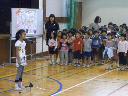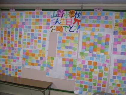 6月26日は本校の開校記念日です。今日はそれに先立ち、計画委員会の子どもたちが開校記念集会を企画してくれました。今年で山野小学校は49歳です。山野小学校にちなんだクイズを考えてくれたり、校歌を歌ったりして楽しい時間を過ごしました。体育館に向かうピロティには、計画委員が集めてくれた各クラスの児童からのお誕生日メッセージが飾られています。来年の50周年に向けて、マスコットやスローガンを集めるので協力してくださいと、代表の児童が声をかけていました。これからがとっても楽しみです。