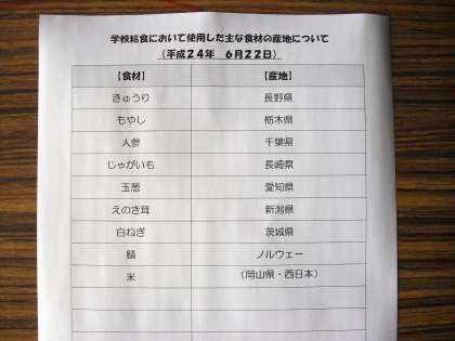 メモは、酢の物に使われている『きゅうり』についてです。きゅうりは、5月から8月にかけての夏が旬の野菜です。きゅうりには、体の中の余分な塩分を外に出してくれるという良い働きがありますが。、生のきゅうりには、他の野菜や果物のビタミンCを壊してしまう悪い働きもあります。この悪い働きを止めるには、今日の酢の物のようにお酢を使う事がポイントです。お家の人にも教えてあげると良いでしょう。