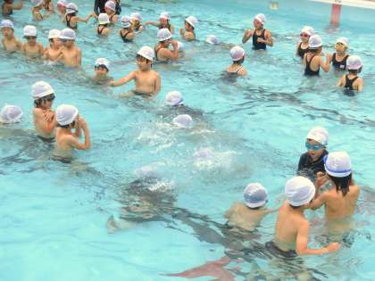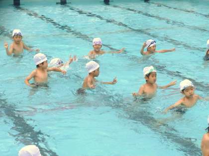 でも、ちょっと冷たいかな。シャワーでは大歓声。水に入ると、いつもは元気いっぱいの子も、少し大人しいくらい。初めてのプール、それでもみんな笑顔で入ることができました。