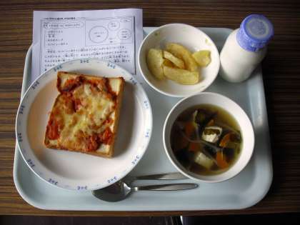 今日は、ピザトースト、牛乳、わかめスープ、スパイシーポテトです。
