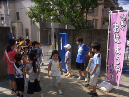 7月のおはようデー、つまり今学期最後のおはようデーは梅雨の晴れ間で最高のお天気でした。おはよう隊が門のところで出迎えて、元気なあいさつをしていました。さあ、1学期もあとわずかです!