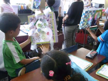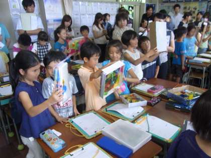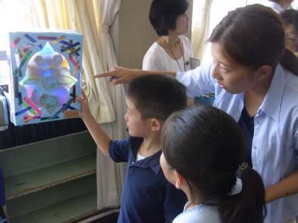 1学期最後の研究授業が7月18日、3年2組で行われました。図工の授業です。「光と色のファンタジー」という題材で、みんなが工夫して作った作品を鑑賞しあう授業でした。授業後の感想では、「みんながアドバイスしてくれなかったら、ぼくの作品はなかった。」「とっても苦労したけれど、みんなに褒められて苦労を忘れた。」など、たがいにかかわり合いながら学習を進めたことが学習の深まりにつながったことがよくわかりました。それにしても、本当に素敵な作品ばかりでした。