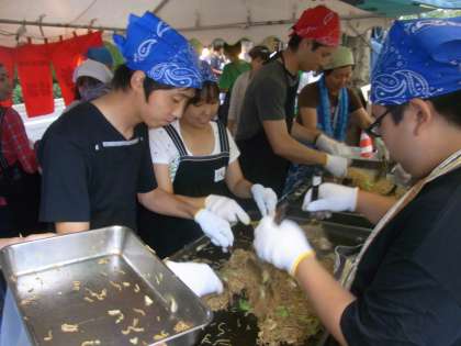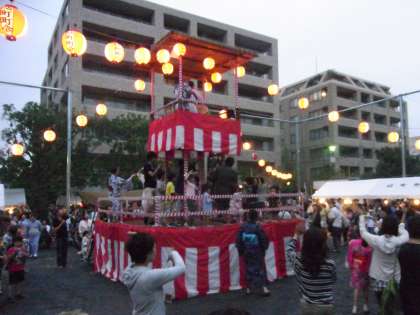 新装開店した三峰公園で、砧町町会の納涼夏祭りが行われました。PTAの皆さんの出される焼きそばのお店を、先生たちもお手伝いします。今年は例年にも増してお手伝いが多く、校長、副校長は焼き手までいくことができず、呼び込みやほかのお店のお手伝いなどをしました。昼間降っていた雨もすっかりやみ、たくさんの人でにぎわいました。てっぺんで盆踊りの練習をした子どもたちも、先生も、そしてわざわざ特訓までしてきたPTA役員の皆さんも、とっても楽しそうに踊っていました。