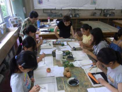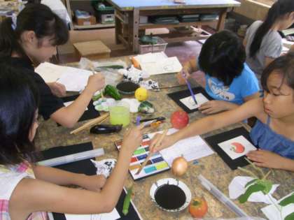 図工室は、内田先生による絵手紙教室で盛り上がっていました。様々な夏野菜を目の前に、子どもたちは絵手紙の世界に没頭していました。墨で下絵を描くときは、ゆっくりと筆を運び、顔彩で色つけする時は薄い色から順々に塗る。思い思いの作品が出来上がり、大満足の笑顔が広がっていました。