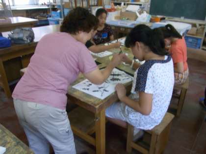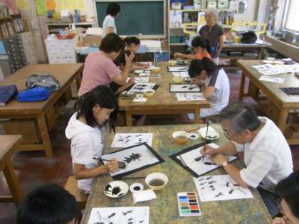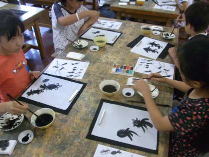 図工室では、倉沢先生による墨絵教室が開かれていました。倉沢先生は、毎年6年生にも墨絵を教えに来てくださっていて、素晴らしい作品を子どもたちは書けるようになります。今日は、入門編として、金魚やカニを書きました。墨の濃淡で表現することを子どもたちは真剣に取り組んでいました。(一緒に参加した大人の人も、超真剣!)