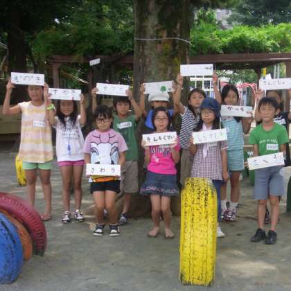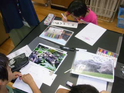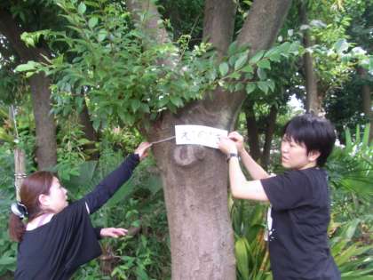 前回調べた山野の山の周りの木の名前を、今日はプレートに書いて表示するという活動に挑戦です。自分の木を選んで、理科室でプレートづくりをして、いよいよ出発。高いところはお手伝いのお母さん方に手伝ってもらいながら、プレートを付けました。プレートを付けると、なんだか今まで以上にその木が身近に感じられました。高橋先生、ありがとうございました。