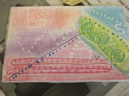 今日は、ガーゼの台紙にたこ糸を垂らし、そこに現れた形に