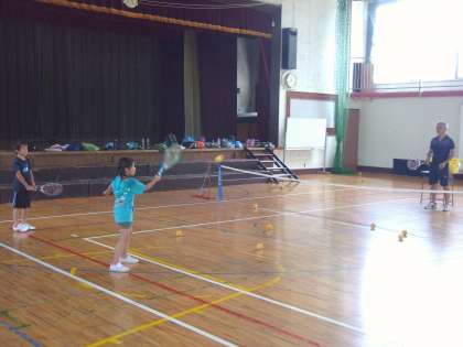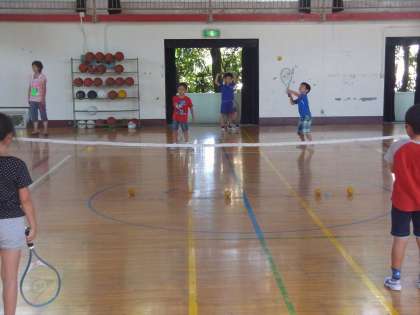 前期も大人気だった、副校長先生のショートテニス教室です。スポンジボールを使用したこのテニスは手軽にできるので、子どもたちもぐんぐん上達します。