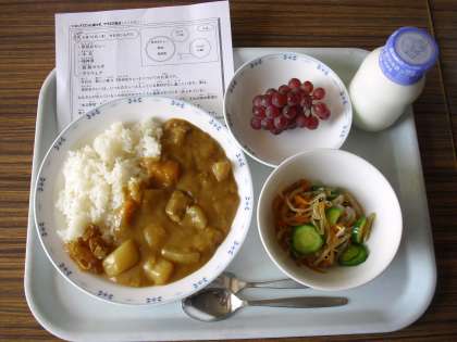 今日は、世田谷カレー、牛乳、福神漬、こんにゃくサラダ、デラウェアです。