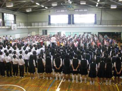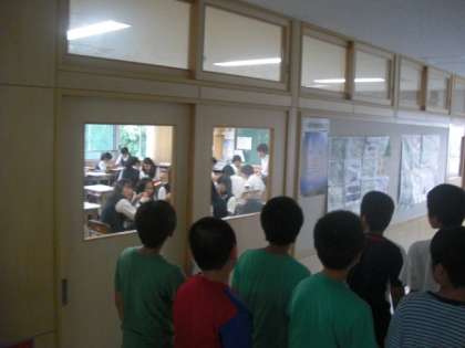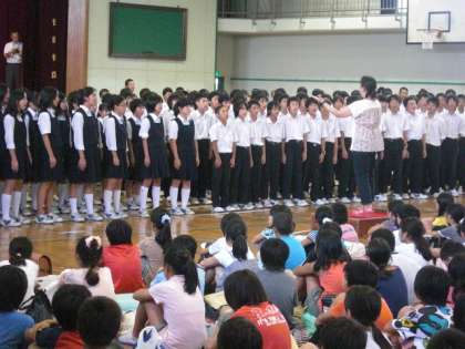 後半戦は、まず校舎内見学です。先輩たちが授業を受けている様子を見て回りました。体育館に戻ると、中学2年生たちが勢ぞろい。素晴らしい歌声を聴かせてくれました。さすが中学生!その後、小学生も一緒になって大合唱。砧中学校の先輩たちと心を一つにしました。