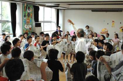 はじめに楽器の起源や楽器と人とのつながりについて講師の松本雅隆先生にお話をいただいた後、「美しい地球」をテーマに新聞紙を使って三楽章からなる音楽を演奏しました。そして、牛乳パックとストローで紙笛を作りました。音の鳴るポイントを探すのに苦労しながらも見つけたときの表情がキラキラと輝いていました。
