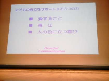 27日成城ホールで、恒例となった砧の学び舎4校合同家庭教育学級が開催されました。今年で3年目になる今回は、ハートフルコミュニケーション代表の菅原裕子氏をお呼びし、「子どもの幸せな自立」というテーマでご講演をいただきました。学び舎でやることで、この地域全体の共通の財産となると同時に、多くの人にお話を聞いていただける場になるといったねらいがあります。菅原先生のお話は、まさに今保護者の皆さんが聴いて、すぐにでも取り組んでみたいという内容でした。大いに笑い、大いに感動しながらのあっという間の2時間でした。