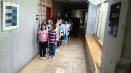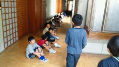 入室してすぐに避難訓練です。自分たちの命を守る大事な訓練です。