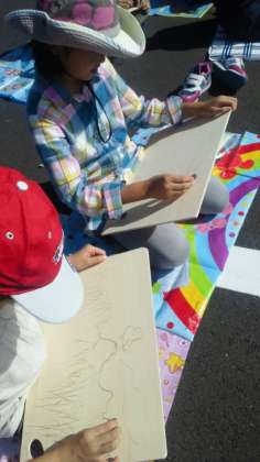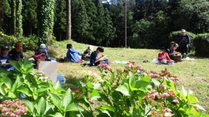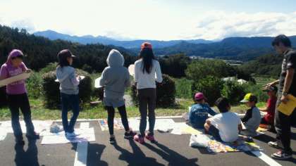 山野小学校は今年の川場で、図工の風景画のスケッチを取り入れました。木の画板風キャンバスに思い思いの場所でパステルで下絵を描きます。学校で色をつけて完成です。出来上がりがとっても楽しみです。