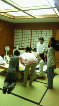 移動教室成功の鍵を握るのは、班長、室長の力です。今日の反省をばっちりして明日に備えました。健康面の報告から、若干熱のある子、腹痛の子がでています。様子をみていきます。さあ、就寝です。おやすみなさい!