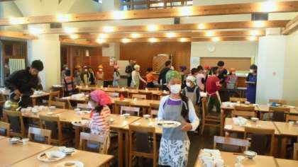 朝食の準備。すべて自分たちでやります。食事係の出番です。最初なので、ちょっと時間がかかりそうです。