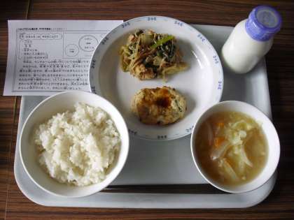 今日は、ごはん、甘辛つくね、きのこ入り煮浸し、じゃがいものみそ汁です。