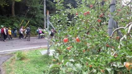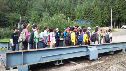 りんご畑の中を歩いて、木材プラント工場のトラックごと重さを計れる計量器にクラスごとに乗って、体重測定。さてどこがナンバーワン?