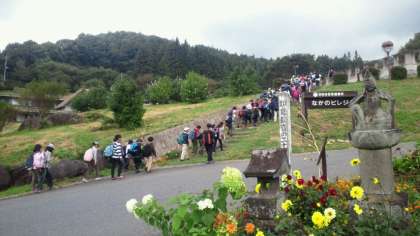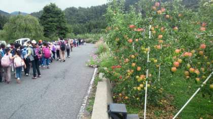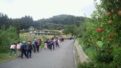 中野ビレジに到着。色づいたりんごと、コスモスの花が迎えてくれました。みんなお疲れ様でした!