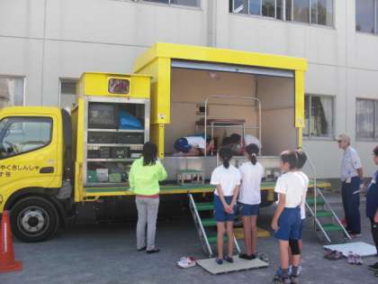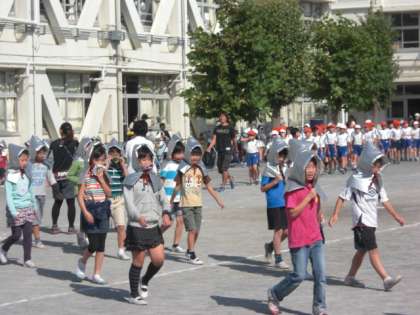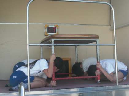 今月は、地震発生を想定しての訓練です。学校公開中なので、参観中の皆様にも、参加していただきました。地震発生後、子どもたちは机の下に頭をかくしますが、参観の皆さんはどうすればいいか、今後の課題です。訓練後、6年生は起震車体験をしました。震度7までの体験をし、そのあまりの激しさにみんな声を失っていました。実際に起こったとき、本当に冷静に行動していきたいです。