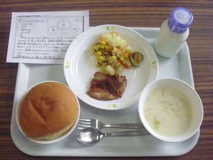今日は、スライス丸パン、牛乳、鶏肉のバーベキューソース、ポテト入りフレンチサラダ、白菜のクリームスープです。