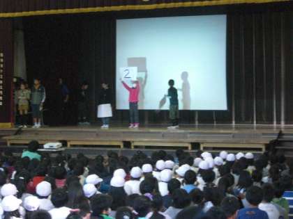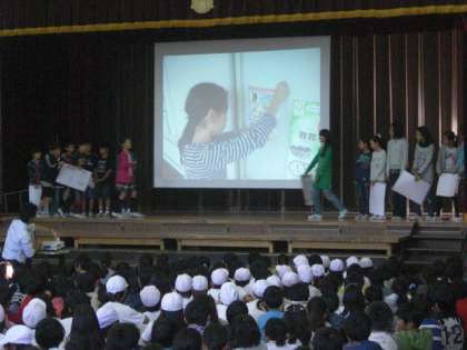 今朝の児童集会は、5つの委員会から活動内容の発表や
