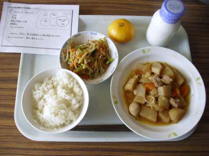今日は、ごはん、大根と豚肉のうま煮、乾物あえ、うんしゅうみかんです。