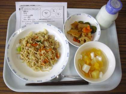 今日は、塩焼そば、牛乳、シャキシャキ野菜、フルーツ杏仁です。