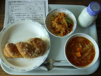 今日は、シナモン揚げパン、牛乳。ミネストローネスープ、大根サラダです。