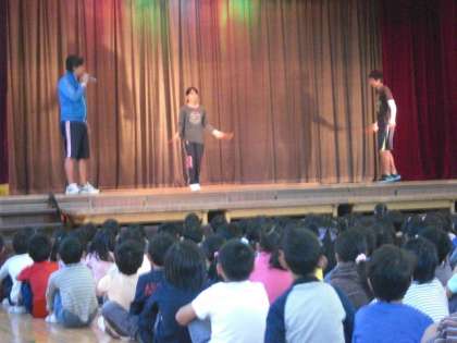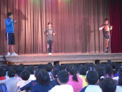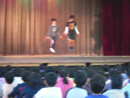 今朝の体育集会は、縄跳びの基本の「き」を