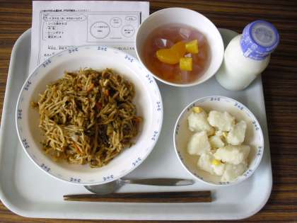 今日は、ソース焼きそば、牛乳、コーンポテト、寒天ポンチです。
