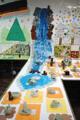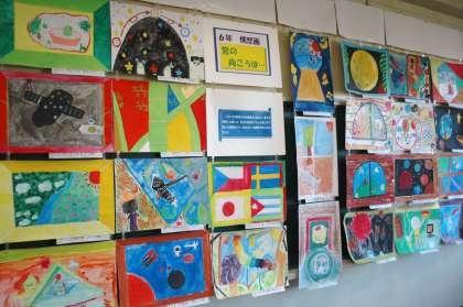 そして、図工室にはクラスごとに工夫した夢の町に、各自の作った焼き物が飾られていて、共同作品になっています。6年間の図工の学習の集大成、どうぞご覧ください。