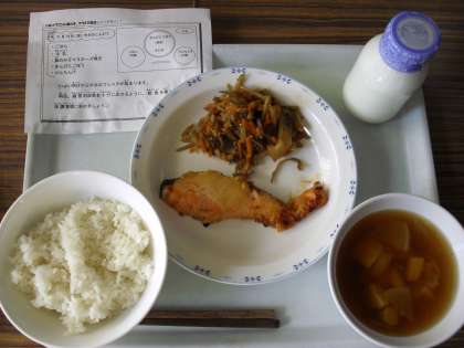 今日は、ごはん、鮭の味噌マヨネーズ焼き、きんぴらごぼう、けんちん汁です。