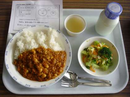 今日は、チリコンカーンライス、牛乳、ブロッコリーのサラダ、パインゼリーです。