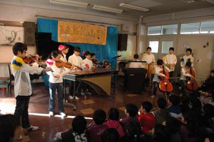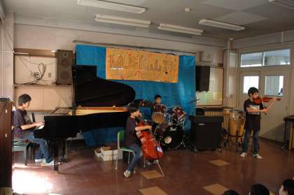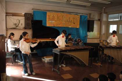 第2音楽室では、様々な音楽系のグループが出演しています。6年生の「THE MUSIC 山野 twelve」はチェロやバイオリンを加えた12人編成。高度なテクニックが繰り広げられます。ジャズのスタンダードのアドリブまでありました!