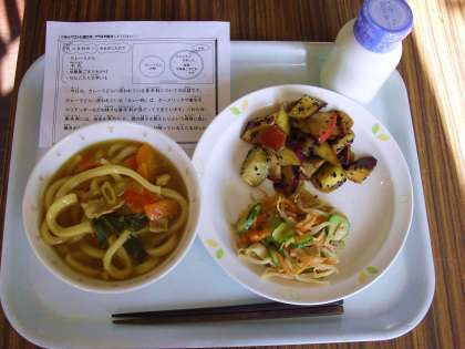 今日は、カレーうどん、牛乳、中華風ごまだれかけ、りんご入り大学芋です。